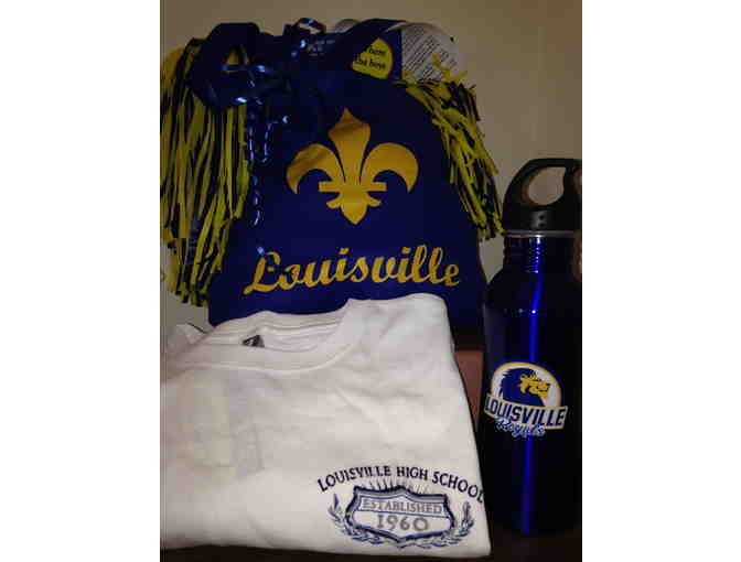 Louisville canvas tote bag includes Louisville size medium t-shirt, waterbottle, Royals wrist band, and pom poms to show your Louisville spirit, and pen.