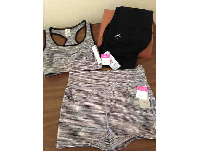 Work out in style! This set by Yi Tong includes matching black and white one size fits all sports bra, size S/M workout shorts, and black solid capri length size S/M pants.