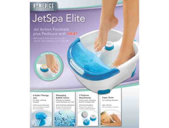 At home enjoy The HoMedics® Jetspa Elite Footbath with Heat that gives your feet a soothing bubble foot massage with rejuvenating water jets for total relaxation. Raised nodes provide a gentle foot massage as the heat further relaxes your feet. The Jetspa Elite Footbath offers a convenient toe-touch control and integrated splashguard to help prevent splashing and spills. The built-in spinning pedicure center comes with three removable attachments, including a pumice stone, cleansing brush and additional massage roller.