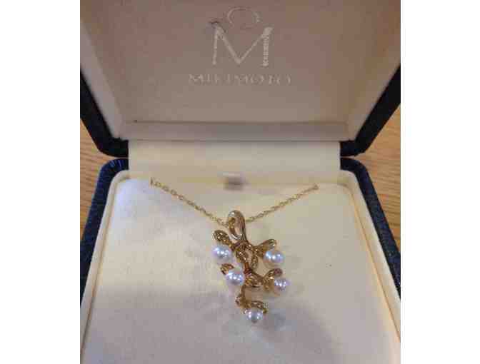 Delicate Mikimoto Akoya olive branch pendant. Cultured pearls set in 18k gold.Chain is 18" long, which can be worn also as 16" with the "O" ring.