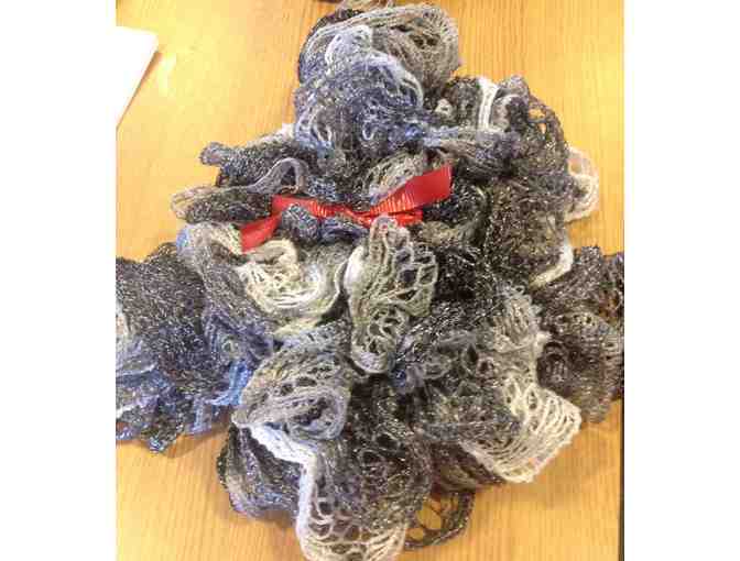 Beautiful black and white hand-knit scarf lovingly made by one of our junior volunteers!