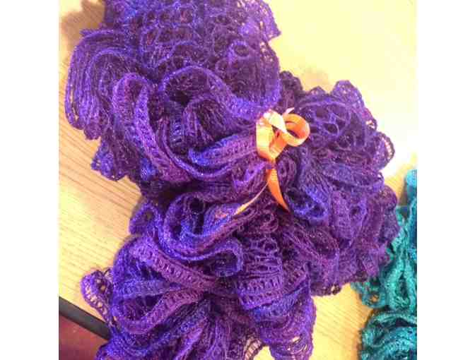 Beautiful purple hand-knit scarf lovingly made by one of our junior volunteers!