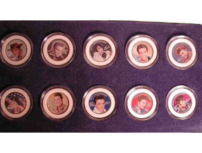 Elvis Presley limited edition colorized state quarters (10 pcs) from Morgan Mint. Released in 2002 on the 25th anniversary of his passing. Custom collectible box with Elvis logo on front.