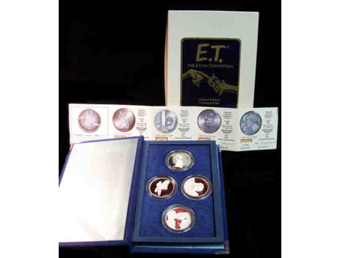 These 4 coins, each at 1/2 troy ounce, .999 fine silver set were minted in limited editon in 1988 by the Rarities Mint with the authorization of Universal Studios. The rounds depict ET and scenes from the 1982 movie. Set with case of issue and COA.