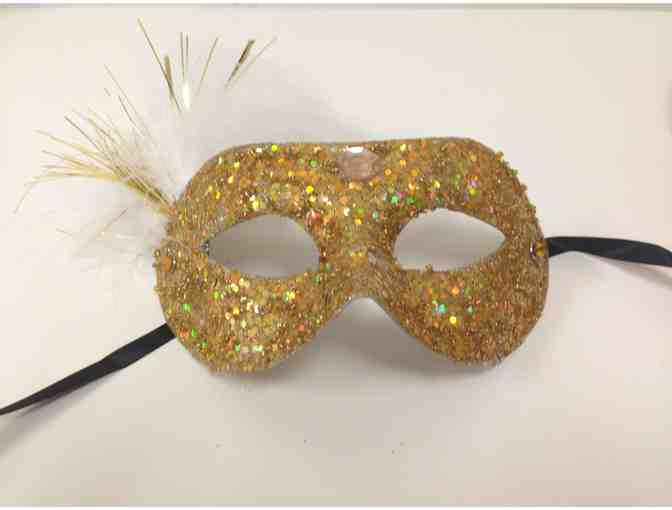 All gold sequin mask. The mask is blooming with a bouquet of white fluffy feather plumes. The mask will be perfect for a "Grand Ball".