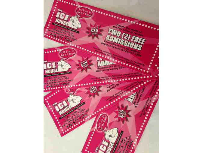 Enjoy an evening with friends at The Ice House Comedy Nightclub & Restaurant in Pasadena. Each ticket is good for two free admissions. Two drink minimum. Reservations must be made in advance.
