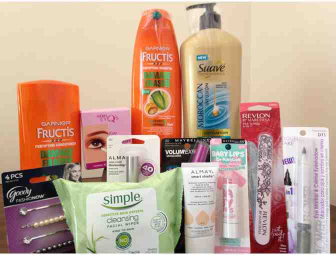 Includes: Garnier Fortifying Shampoo and Conditioner, Suave Professionals Morocan Infusion Body Lotion, Simple sensitive skin cleansing facial wipes, Andrea Eye Makeup Correctors, Almay One Coat Thickening Black Mascara, Maybelline Big Eyes Volum'Express Blackiest Black Mascara, Flower Eye Marker and Creme Eyeshadow in Poolside Kiss shade, Maybelline Baby Lips Pink Me Up Lip Balm, Almay Smart Shade SPF 15 skintone matching makeup, Revlon 6-in-1 File'N Peel nail file, and Goody 4 piece decorative hair bobby slides.