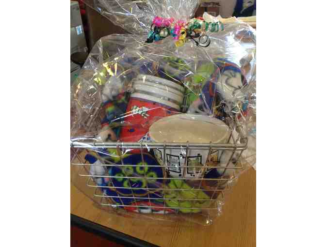 Pick up this sweet basket full of goodies for your cat- a ceramic treat jar, water bowl and fuzzy blanket!