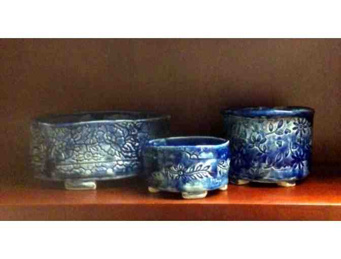 This set of three bonzai planters are hand thrown and finished with a beautiful cobolt blue glaze with imprint designs. The largest planter measures 9" across and just over 4" high. The middle planter is 5 1/2" across and nearly 4 3/4" high and the smaller planter is 4 1/4" across and 3" high.