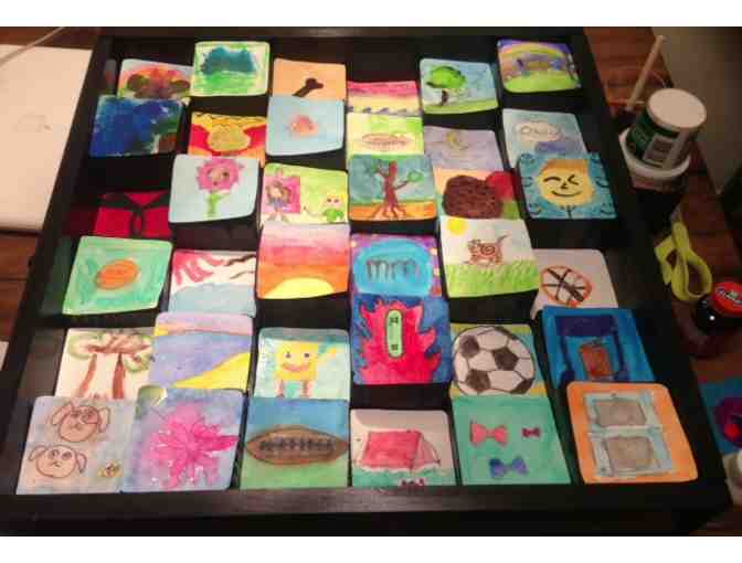 A 3-D watercolor art piece, highlighting the sixth graders "favorite things on the planet". Each watercolor piece is mounted on a wooden block. All of the blocks were mounted together to create a uniform piece of all of their favorite things. The piece is mountable and dimensions are 24"x 24".