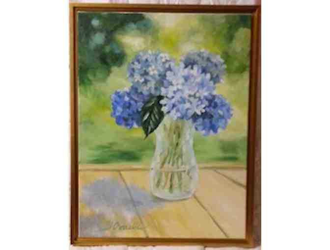 Bringing simple beauty in the form of blue hydrageas, Borrelli's acrylic painting is reminiscent of a peaceful spring day.