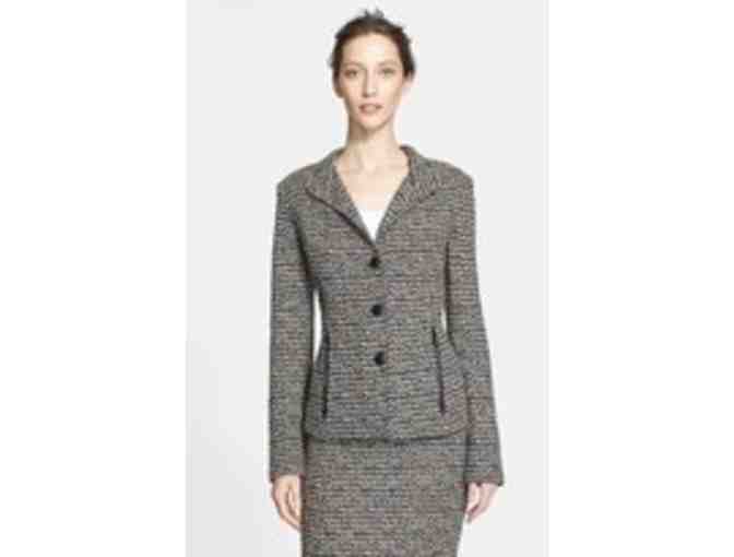 Warm, autumnal yarns are meticulously knit into a lovely tweed jacket accented by Italian leather welt pockets. A trio of buttons nips in the silhouette for a distincly feminie look.