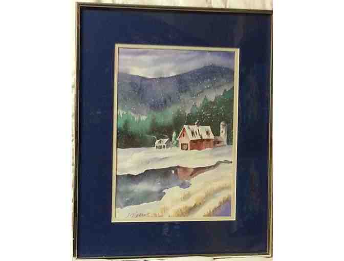 Amongst falling snow, Giglio's Winter Barn, tucking in the warmth, looks over expansive snow-covered fields.