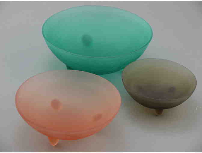 This set of beautiful glass "spike" bowls are from Hudson Beach Glass in Beacon, New York. Hudson Beach Glass describes them as, "Functional & Sculptural Hand Cast Glass." These bowls are not just gorgeous, but are meant to be used practically as well. Imagine a dinner party where your bowls steal the show! We'll let the photos do the talking for this item...