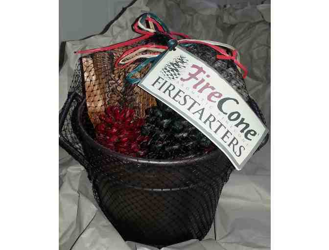 Pine fatwood sticks and wax starter pine cones are efficient fire starters and fill your home with a woodsy balsam scent. They come in decorative matte-finish bronze metal buckets: Great on a hearth or as part of a holiday centerpiece and also great gifts!