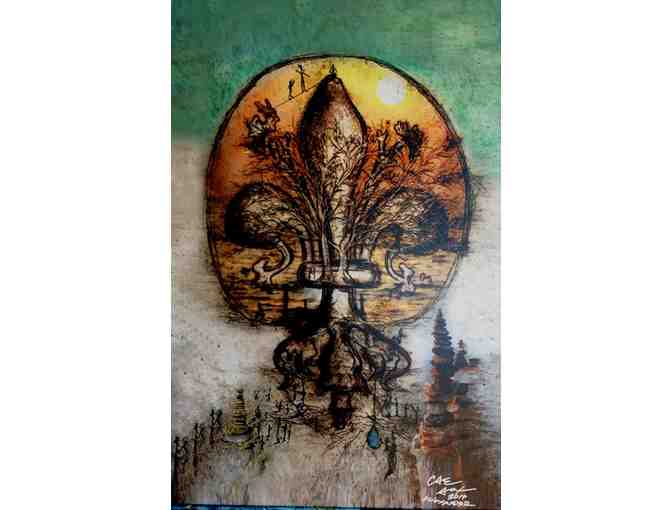 With over 350 Original Fleur de lis designs inspired by Louisiana's rich culture, the work speaks to the diverse colors of the Cajun, the Roughneck, the Creole, the Hurricane Survivor, the Swamp Rocker, the Rice Farmer, the Mardi Gras Queen, and the Jazz Musician. The "Fleur de lis-Worlds Within Series" began in 2007 and captures the essence of the artist's native community.