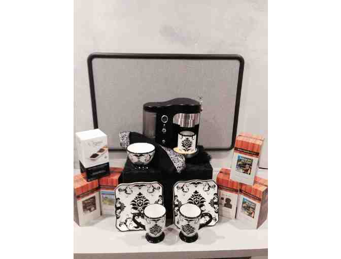 Enjoy this lovely Coffee Gift Package, including a black Suncana H701A Pod Brewer, six Wolfgang Puck coffee pods packs of October Spice, Toscana, Jamaican Me Crazy, Organa English Breakfast Tea and Chefs Reserve.
