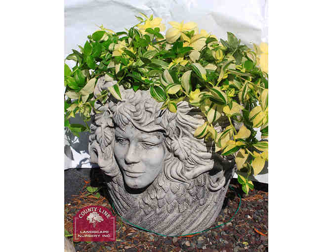 This beautiful ornate concrete planter will be an eyecatcher on your patio or deck or in your sunroom. It is distinctive and a conversation starter in addition to being lovely. Comes with a Wandering Jew plant.