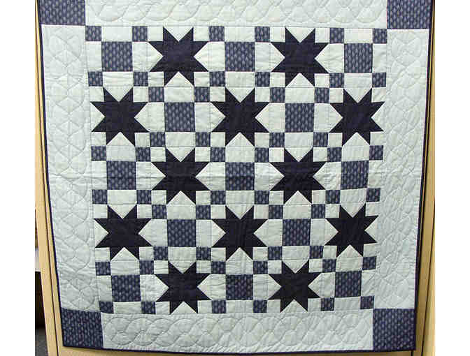 This beautiful quilt measures 46" x 46" and would be a great addition to your home. This hand made quilt was pieced together by Peter Becker Community resident Libby Klopp and quilted by the PBC Quilters Club. Features a star design on one side and a cross design on the back. Two tone blue color.