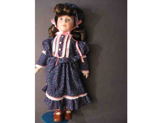 Value $40 This young lady will bring Little House on the prairie to mind as the blue eyed, curly haired brunette doll is wearing a navy blue calico dress trimmed with pink ribbons. She wears a matching sunbonnet on her head. Her white socks and burgundy shoes complete her charming old fashioned look. The doll is 16 inches tall and comes with a stand. The doll is in her original box. Condition of doll is excellent, does not have any wear or damage.