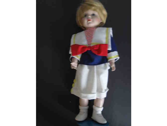 Value $40 This doll is ready for a sea cruise! With her bobbed strawberry blonde hair and her blue eyes and sailor style suit, she is an adorable tom boy. Atop her white knee length and cuffed short she wears a red, white, and blue tunic with a wide white collar and red bow. Her socks and shoes are white. The doll is 16 inches and comes with a stand. The original box accompanies the doll, but it has some damage which has been taped. The doll is in excellent condition without any damage.