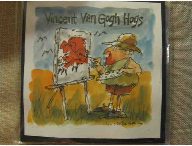 Value $75 A charming pun for the title, this original Jim Johnson watercolor depicts a bespectacled artist in a field painting a Razorback. Love the Hogs? This is for you! Love art? This is for you! Love wordplay humor? This is for you! 71/2 inches by 71/2 inches