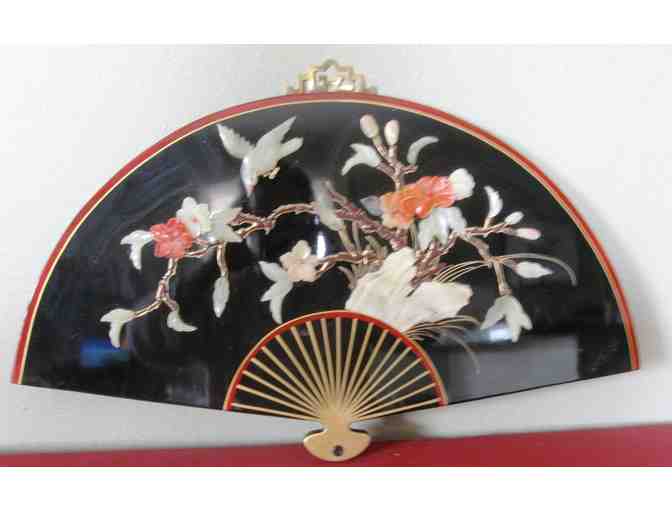 Asian style hand-painted lacquered wooden fan with jade and semi-precious stone carvings of flowers and birds. A real find!