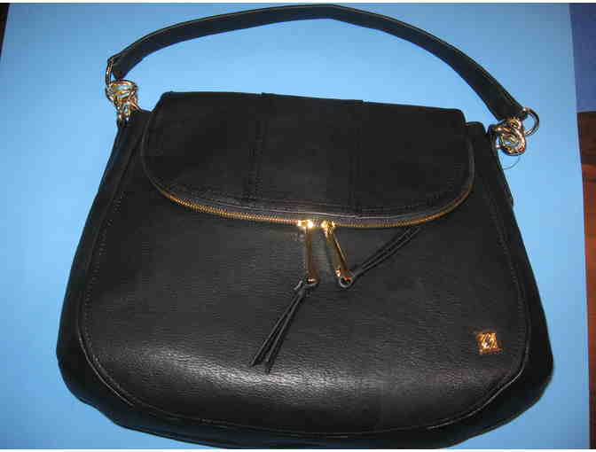 Value $100 Large black leather flap bag with zippered flap, chain and leather handle by Antonio Melani