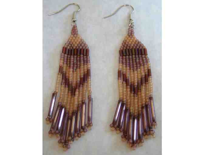 Purple and pink beaded earrings. Hooks made from sterling silver. Measure 3" long.