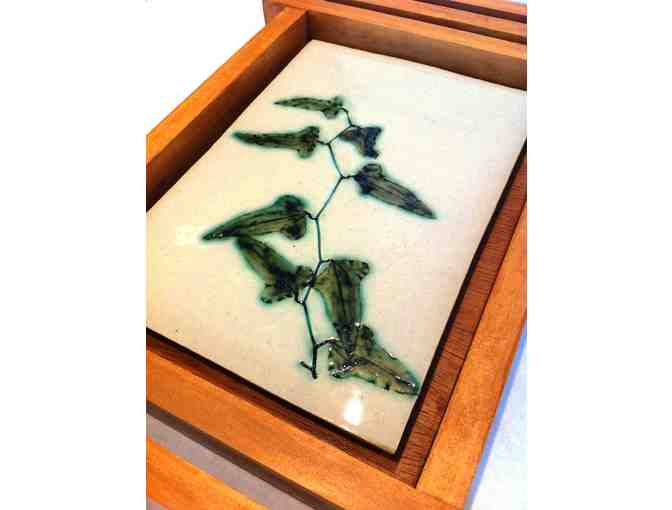 Clay tile has an imprint of a similax vine from Topsail Island. The frame is handmade from a North Carolina pine.