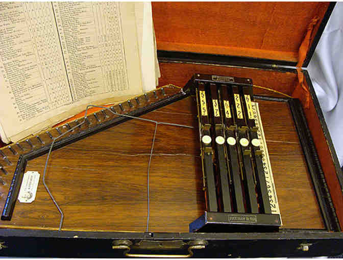 Music instrument collectors, take a look at this. Here is an original 1882 Autoharp with music sheets. It is in the original locking box!  The Autoharp is made by C.F. Zimmermann and comes in the original wood case with a felt lining and key to lock included. There are no strings to this instrument but it and the attractive locking box still make a great collectible combination.  Sheet music is also included with this item.
