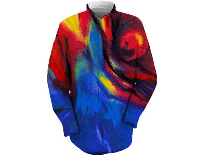 On a more personal experience note: When I ordered the original samples, I could not resist ...I had to wear them, and these art shirts have become my "go to essential" in my wardrobe! I could not begin to even describe how comfortable and versatile they are...with jeans, open with a tank under, or belted...they are color saturated, have long lasting sturdy heft, yet these shirts are so dang comfortable, I keep ordering more! Yes, it is fun..really WAY COOL to WEAR ART!! (WBK)
