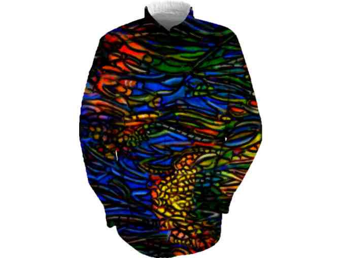 On a more personal experience note: When I ordered the original samples, I could not resist ...I had to wear them, and these art shirts have become my "go to essential" in my wardrobe! I could not begin to even describe how comfortable and versatile they are...with jeans, open with a tank under, or belted...they are color saturated, have long lasting sturdy heft, yet these shirts are so dang comfortable, I keep ordering more! Yes, it is fun..really WAY COOL to WEAR ART!! (WBK)