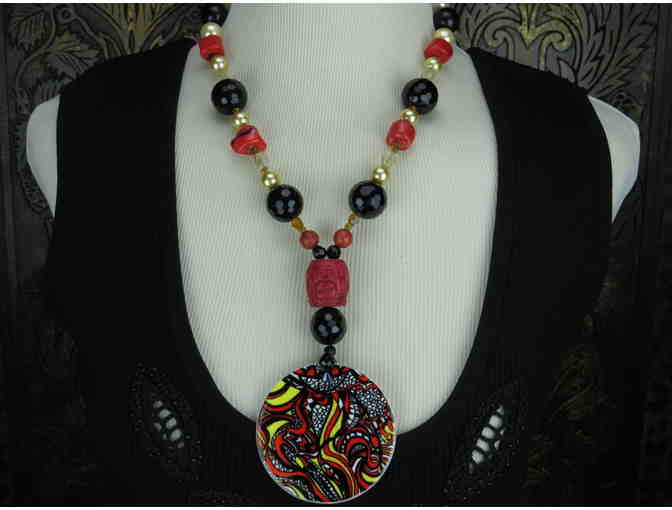 - FEATURES: CARVED CINNABAR, FACETED AND SMOOTH ONYX, CITRINE, CORAL, AUSTRIAN CRYSTAL PEARLS