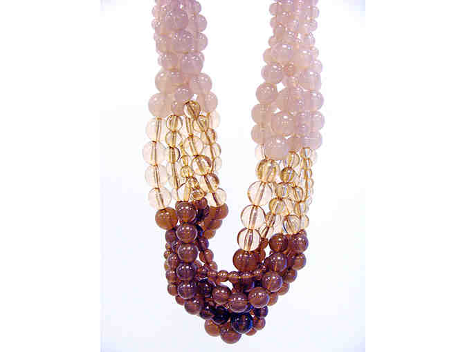This fashion necklaced is a Premier Designs exclusive. Features acrylic beads in shades of pink and amber. The necklace has 6 strands of beads braided together. Copper color lobster claw clasp. 16". In gift box and ready to give as a gift or wear.