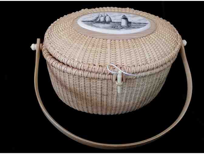 Traditional Nantucket woven straw back with oval scrimshaw plaque on hinged lid. Semi circular wooden handle. 10 inches wide by 12 1/2 high including handle.