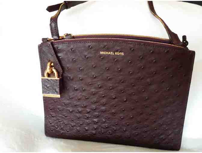 Michael Kors stunning "Casey" Ostrich Embossed Crossbody Handbag. Color: Dark Bordeaux Wine. Measures: 10"W x 8"H x 2"D. 22" - 24 " crossbody strap drop.