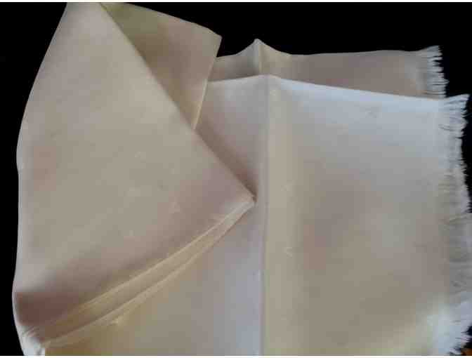 Oblong white silk jacquard (with bees) scarf, small fringe at ends. Labeled: "HERMES - PARIS Fabrique en France 100% Soie". 36 " x 57"
