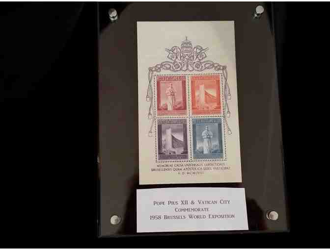 Issued in 1958 in the Vatican commemorating Pope Pius XII and the 1958 Brussels World Fair. In clear frame (6.5" x 8.5")