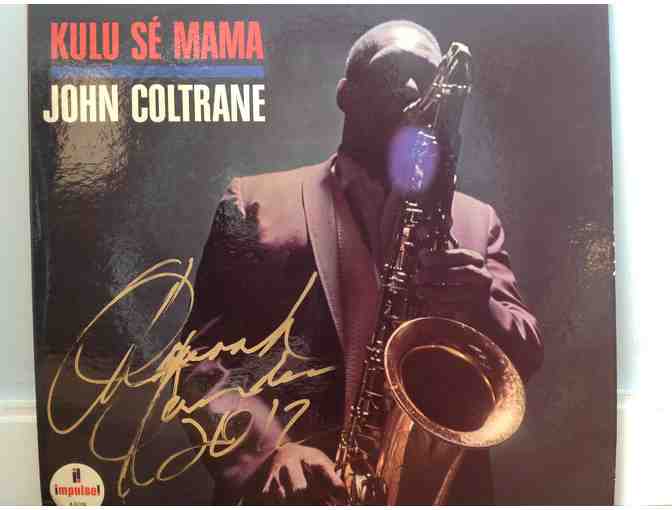 John Coltrane's "Kulu Se Mama" vinyl LP, Impulse label, autographed by Saxophonist, Pharoah Sanders, framed in black rim glass frame.