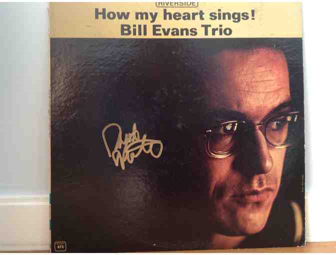 Bill Evans' "How My Heart Sings" vinyl LP, Riverside label, autographed by drummer, Paul Motian, framed in glass.