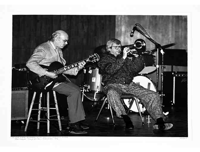 Hank O'Neal captures the performance of Jim Hall & Bob Brookmeyer at the Zoot Sims Memorial Concert, December 14, 1986, NYC, matted in white, unframed.