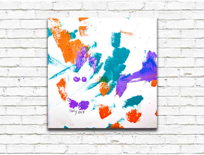 Another modern piece by Dolly the elephant, "The Kiss", uses bold orange, purple and teal on white canvas. It is sealed with a kiss, showcasing a trunk print from this great artist.