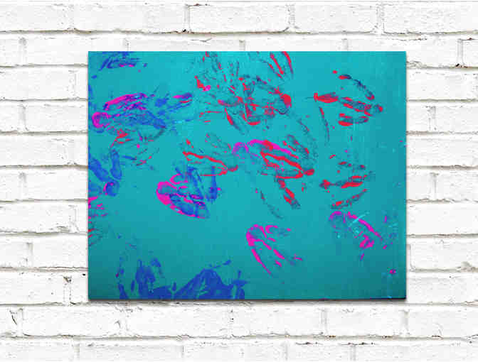 Zoo penguins waddled onto paint and then canvass to create "Footloose." The stark colors chosen by the animals coupled by the dramatic placement shows the movement only these feathered friends could purvey with their webbed feet.