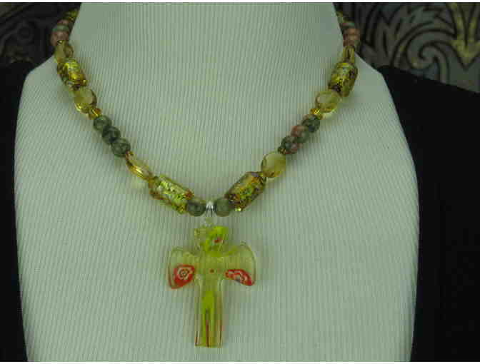 - FEATURES: YELLOW/RED ART GLASS CROSS PENDANT, CITRINE AND YELLOW JADE