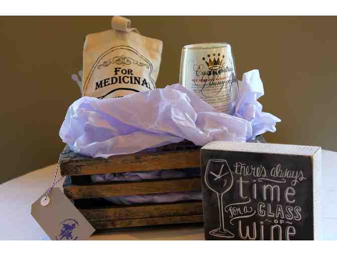 Savor a chilled glass of pinot grigio while admiring your fabulous new gems from The Purple Rose of Northborough, the store that provides an eclectic mix of quality and distinctive shabby chic style. This specially selected gift basket, which is a treasure itself, includes: one JCK wine glass, a droll kitchen chalk style box, a clever JCK canvas wine bag, a Fringe Studio glass tray that will make you 'smile' and one very enjoyable bottle of pinot grigio wine.
