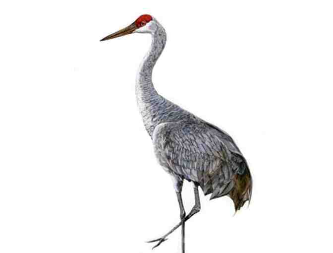 From the artist: "Fossile records indicate that cranes were flying 54 million years ago during the Cenozoic Era, long before monkeys, apes, or humans appeared. Now, there are fourteen crane species existing worldwide. Two of them, the whooping crane and the sandhill crane, are found in North America. Although not as perilously close to extinction as the whooping crane, the sandhill cranes have dwindled as the prairies, fields and marshes disappear. Of the four sandhill subspecies, the non-migratory Florida crane is the most rare. This long-legged wader can grow to 45" in length with a rust-stained grey body and bare red crown. In flight, its long neck is extended, while its stilt-like legs trail and its wings intermittently glide. Sandhills exhibit the spectacular crane habit od "dancing", an activity which is practiced year-round, but is most predominant during courtship. In a dramatic exception to most acian courtship patterns, the females participate as avidly as the males. Wings half-open, they leap 6 to 8 feet in the air as they bounce, circle, skip, gracefully whirl, and bow. The monogamous sandhill mates for life and separates from the flock anly during the breeding season to build nests of aquatic vegetation. The incubation period for its two olive-buff eggs is about 30 days. The brownish downy chicks can run about shortly after hatching, and have been seen "dancing" when only a few days old. They are able to make short flights at two and a half months. Although 10 different calls have been identified, the most distinctive is a harsh vibrant trumpetlike "gar-00-000" which, like the honk of geese, can still be heard after the birds have flown out of sight. The trachea of the fully grown sandhill crane is lengthened and coiled upon itself, resembling a French horn. The resonant call emanates from this convoluted windpipe in the hollow keel of the breastbone."