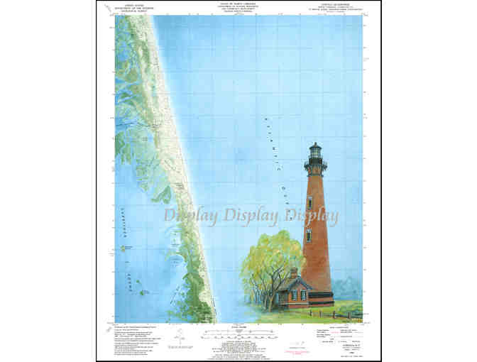 These six prints each feature a painted lighthouse on its coastal topographic map.