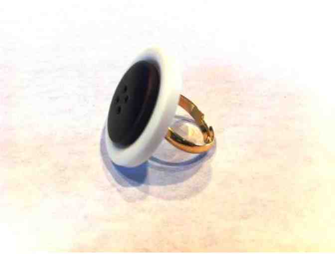 Brown and white button ring made from antique buttons. Ring measures just over 1" and has an adjustable band.