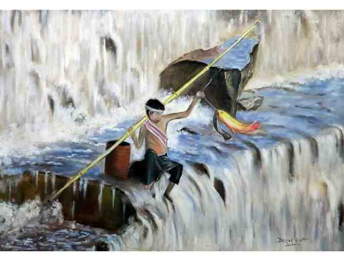 "Thai Boy Fishing In The Waterfall" by Artist Derek Rutt: 9x12" CANVAS!